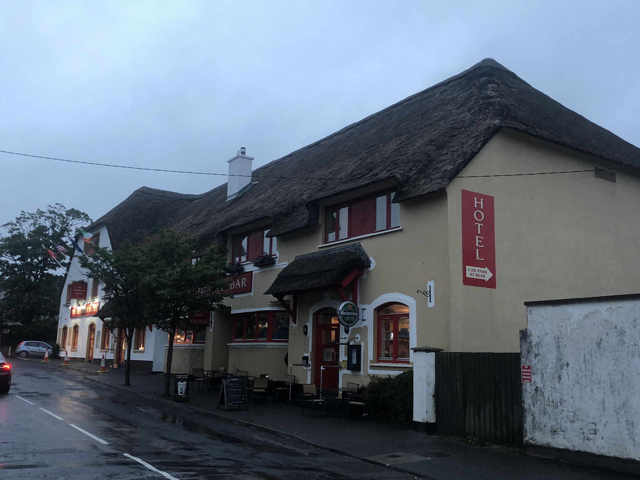 Booked a hotel room in Kinvarra – somewhere I could get to by 10pm. The winds are going to be dangerously high overnight so I wanted to get in somewhere at a decent hour. From the hotel blurb: This hotel is the largest thatched-roof hotel in Ireland. Hoping the wind doesn’t blow it off tonight 🤔