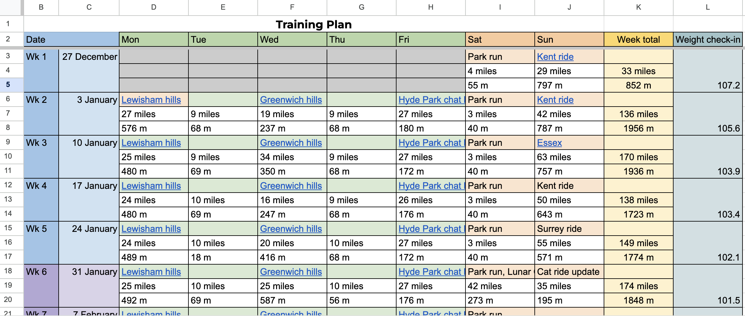 I created a spreadsheet that pulls in the summary data of my training rides from Strava. This lets me see how my progress matches up with my intentions as the weeks progress: